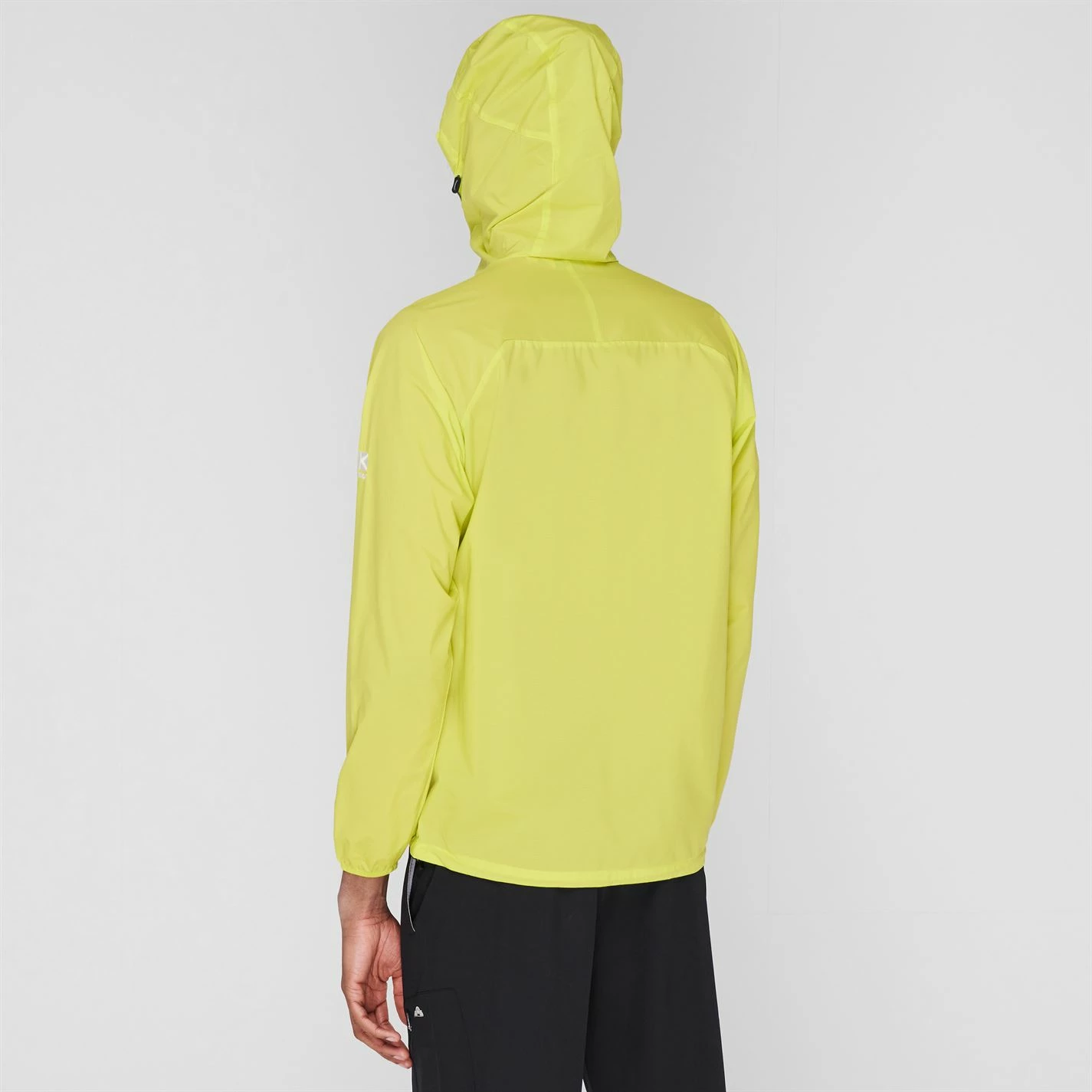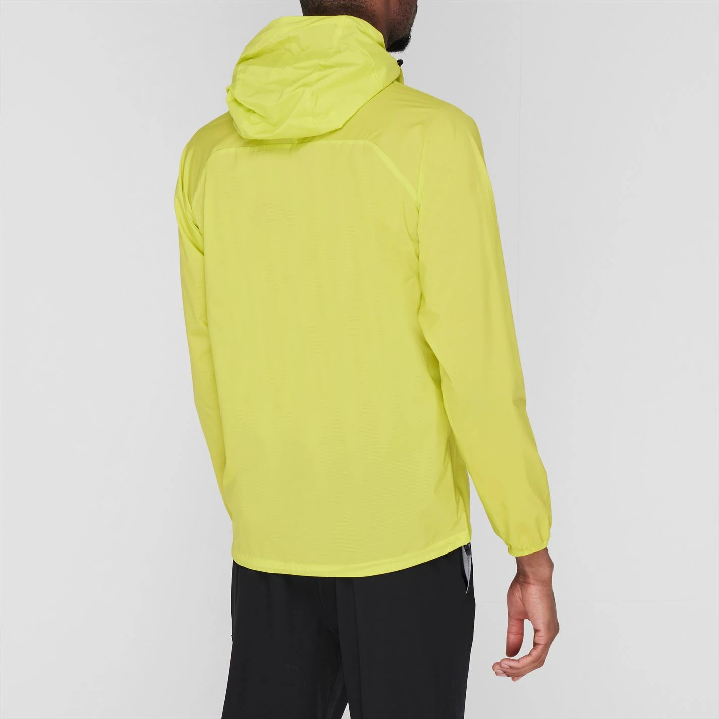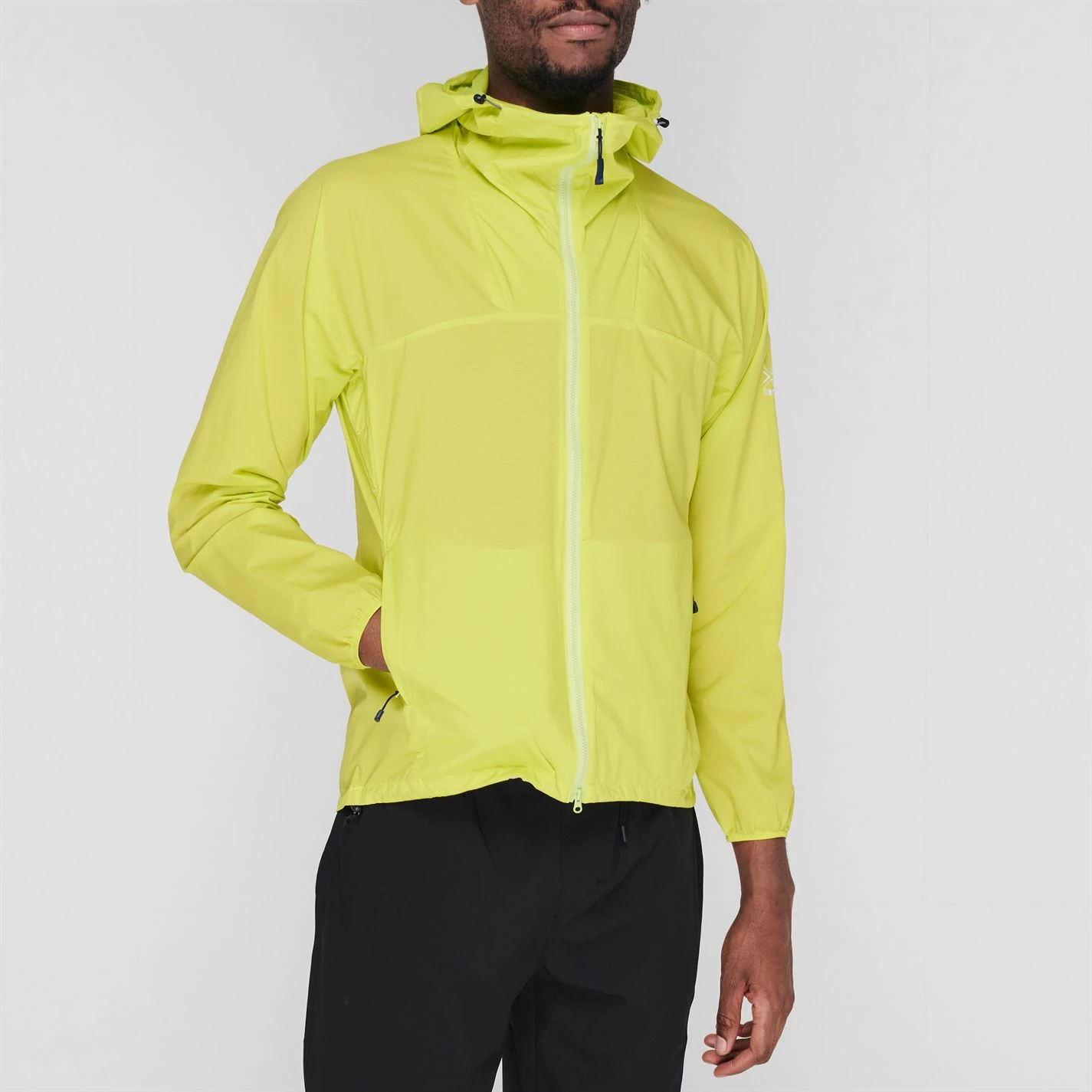 Wind shell jacket with high stretch fabric . It increased comfort and decreased inside humidity keeping windbreak performance. Front zipper is light and easy to handle. Giving design accent to surface of fabric by using different color yarn.