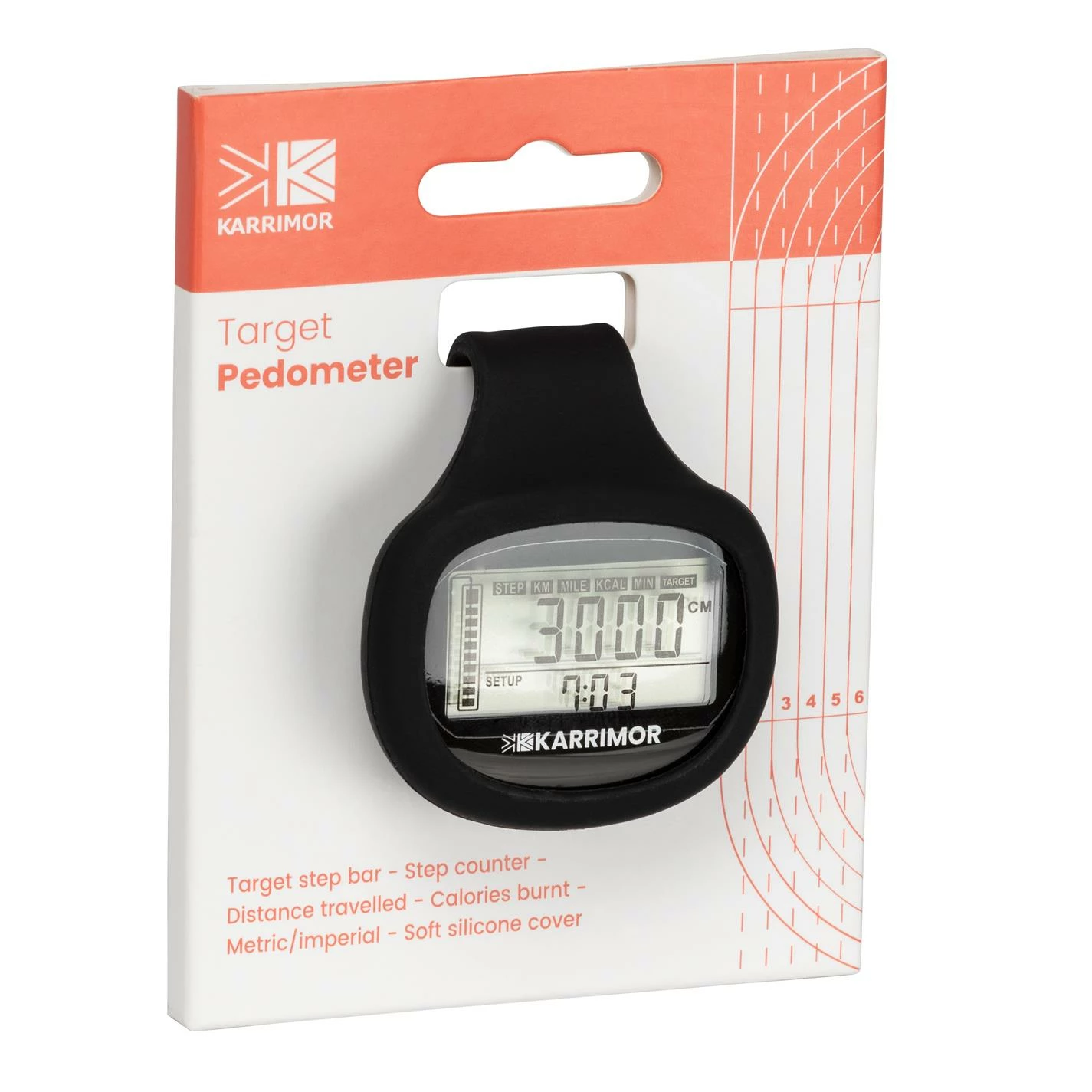 Make sure you stay active with this Karrimor Xlite Pedometer. The pedometer features a target step bar to make sure that you are taking the recommended amount of steps each day so you have something to aim for. The easy to read display shows your step counter, distance travelled and calories burnt with the ability to change the settings between metric and imperial to suit you. The soft silicone cover keeps the pedometer protected along with a clip fastening to keep it fastened to your waistband with ease.